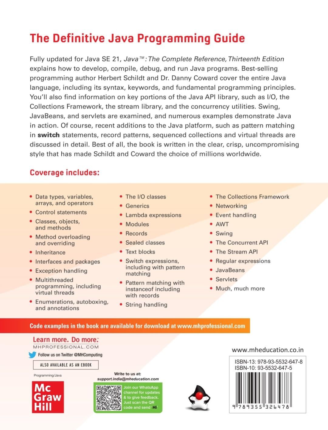 Java: The Complete Reference, Thirteenth Edition features clear explanations, detailed code samples, and real-world examples that demonstrate how Java can be put to work in the real world. JavaBeans, servlets, applets, Swing, lambda expressions, multithreading, and the default interface method are thoroughly discussed. Readers will get full details on all of the latest features and changes in JDK 18 through long-term support (LTS) release JDK 21.